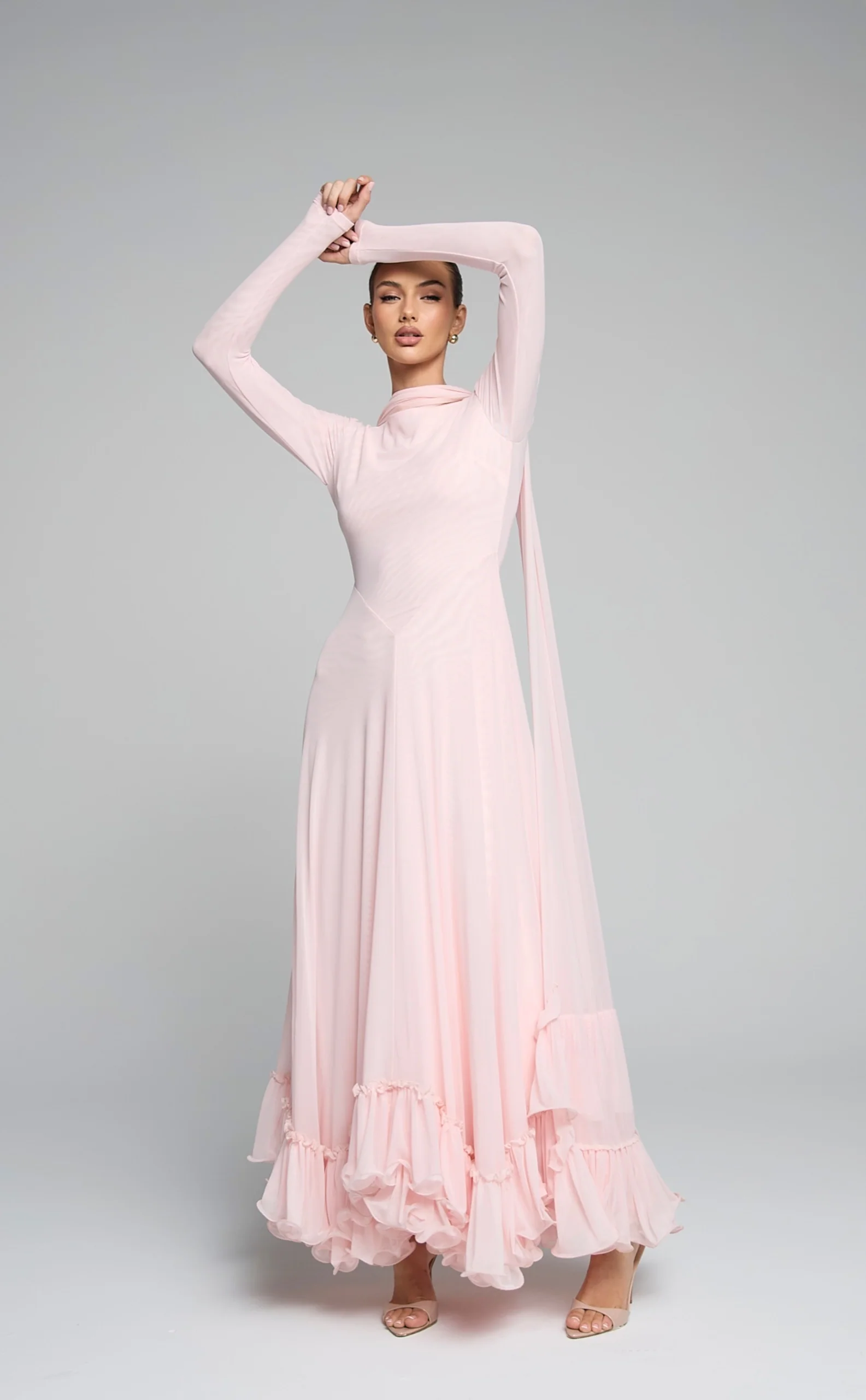 The Anabella Dress is a refined study in modern femininity and fluid design. Featuring a softly contoured bodice and a flowing silhouette, the piece moves with effortless elegance. An integrated scarf detail wraps the neckline and finishes with delicate ruffles, adding a romantic, sculptural touch. The skirt falls gracefully into a ruffled hem, enhancing movement and lightness. Designed for elevated occasions, the Anabella Dress embodies understated luxury with a soft, ethereal presence.