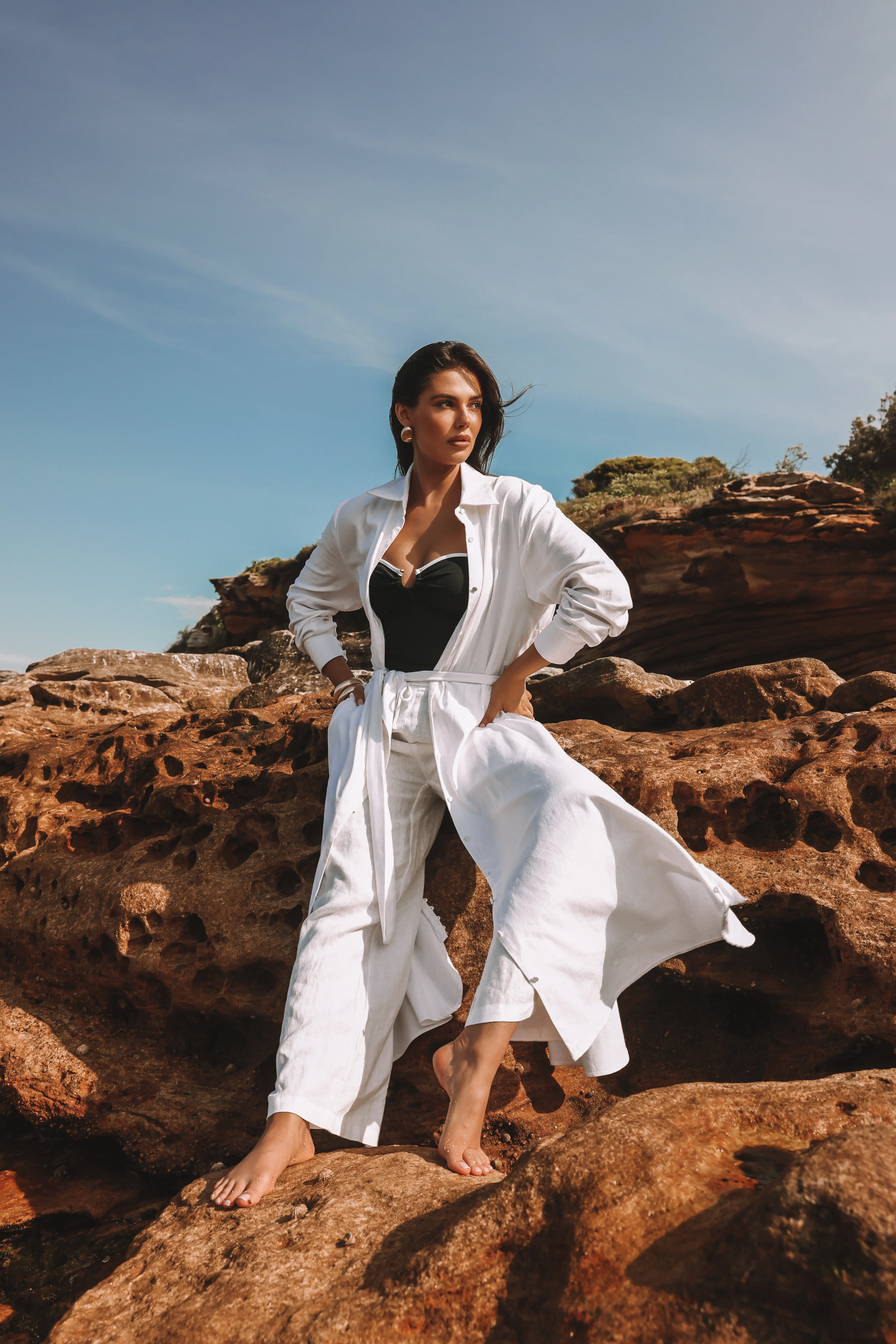 The Athena shirt dress features buttons along both side seams, allowing it to be worn open as a relaxed shirt or closed for a sleek, buttoned-up look. Designed with a matching belt, it can be cinched at the waist for a flattering silhouette or worn loosely for an effortless style. Perfect for any occasion, this dress shirt combines modern functionality with timeless appeal.