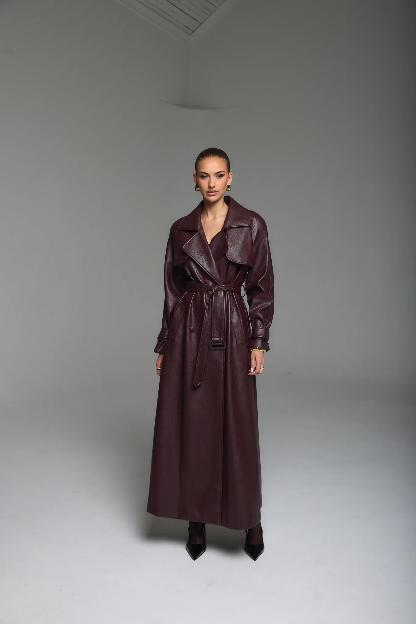 Darla is MUZA’s take on the classic trench, reimagined in sleek faux leather for bold winter elegance. With its elongated silhouette and fluid movement, this coat drapes the body with quiet power and luxurious structure.
