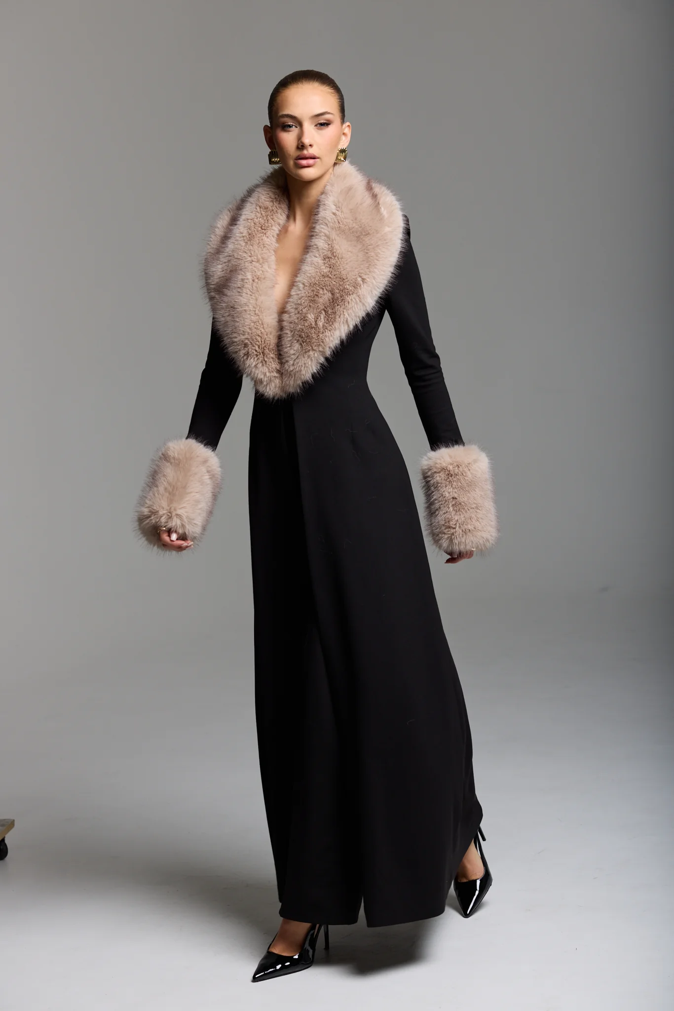 Effortlessly poised and unapologetically luxe, Tiffany is the winter statement piece your wardrobe has been waiting for. This full-length jacket features a striking detachable faux fur collar and matching cuffs offering two looks in one: full glamour or clean tailoring.